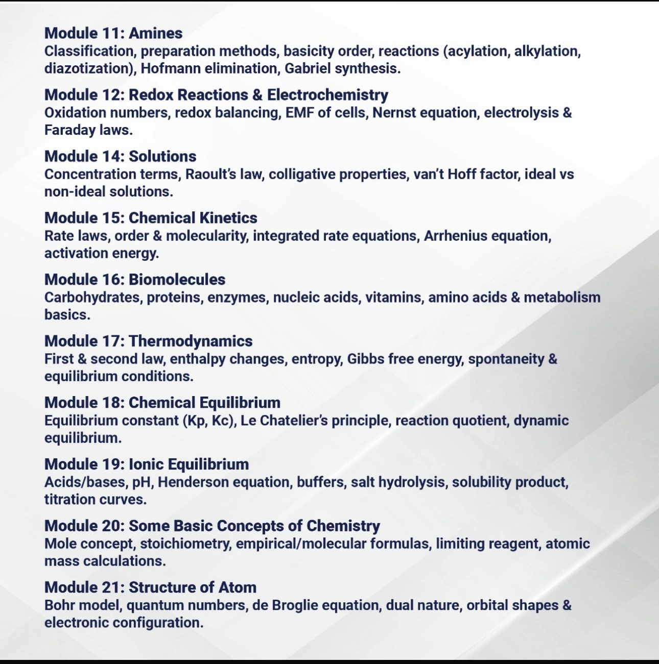Module 19: Ionic Equilibrium. This module explores the behavior of weak acids and bases, solubility products, common ion effects, buffer solutions, and the calculations of pH in various systems. Designed for clarity and application, it provides conceptual explanations, problem-solving strategies, and real-world examples to help learners build a solid foundation in chemical equilibrium involving ions. Perfect for students preparing for Neet and Jee exams or advancing their understanding of physical chemistry.