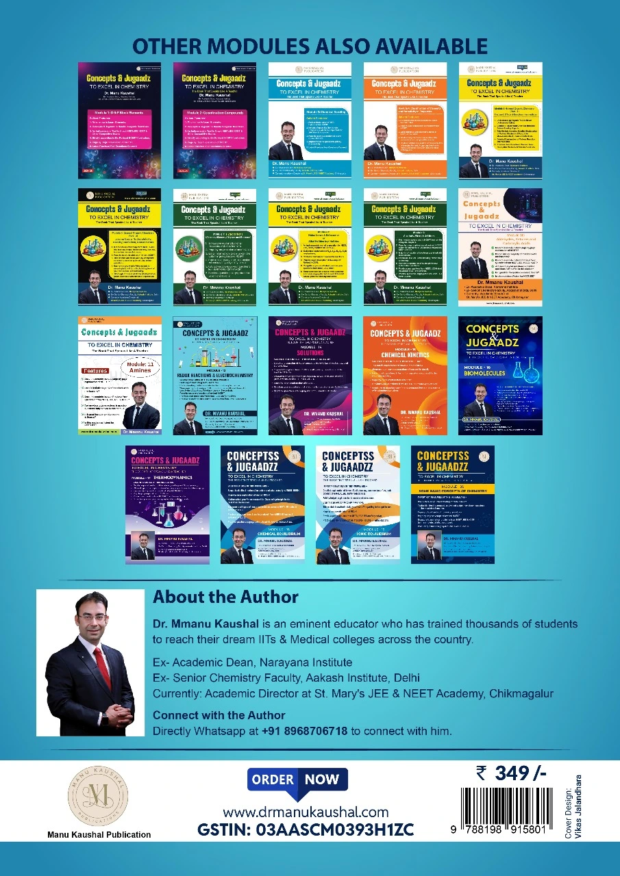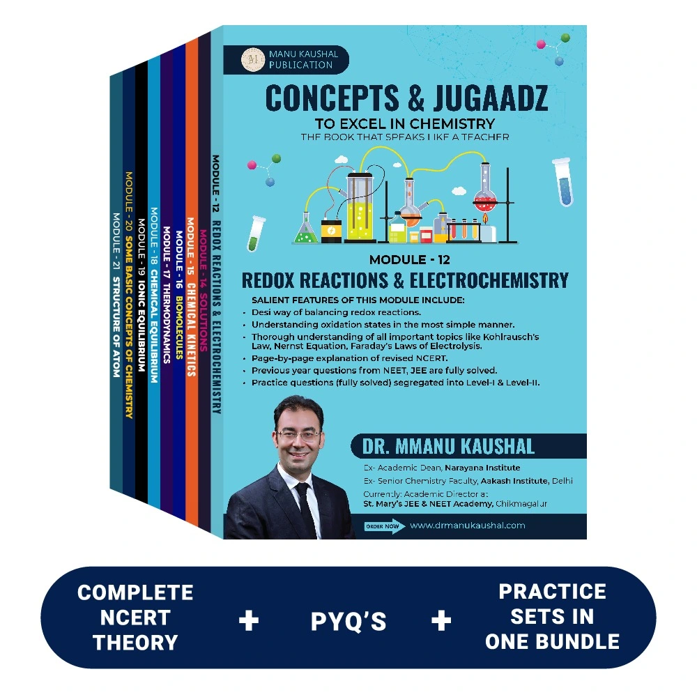 Master the entire Class 11 & 12 Chemistry syllabus for NEET 2026, JEE Main & JEE Advanced 2026 with the Complete Chemistry Books Bundle by Dr. Manu Kaushal. This all-in-one set covers Physical, Organic, and Inorganic Chemistry, offering simplified NCERT-based theory, reaction mechanisms, solved examples, PYQs, and chapter-wise practice sets. Designed for serious aspirants who want accuracy, clarity, and guaranteed score improvement.